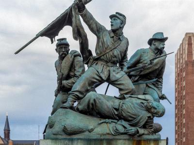 The Victorious Charge is a striking bronze Civil War memorial by American sculptor John S. Conway, located on the Court of Honor along West Wisconsin Avenue in downtown Milwaukee. Unveiled in 1898, the sculpture stands nearly 10 feet tall and rests on a substantial 20-foot square granite base. It remains one of Wisconsin’s most significant 19th-century tributes to the Union cause.