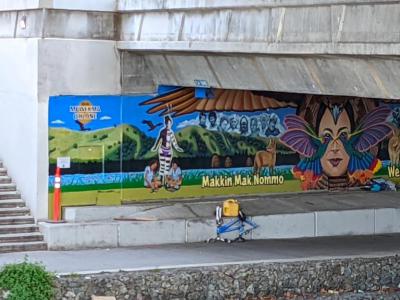 Central to the mural is a portrait of Muwekma Ohlone Chairwoman Charlene Nijmeh, wearing the traditional warrior eagle headpiece of the tribe. On either side of her, floating in the clouds are portraits of the elders of the tribe, while below are children engaged in traditional activities, a symbol of the continual and continuing life and traditions of the Muwekma Ohlone people. Painted in bold letters are the words “Makkin Mak Nommo (We Are Still Here).”