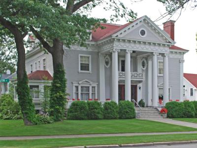The Wellington Inn stands as a striking example of Academic Classicism architecture. Its grand façade is adorned with a pedimented portico supported by paired giant Ionic columns, creating an imposing entrance that commands attention. The meticulous attention to detail is evident in the Ionic corner pilasters, ornate cornice featuring swags, modillioned eaves line, and a carved swag embellishing the entrance, all of which contribute to the house's stately appearance. Originally constructed for the son of the president of the Oval Wood Dish Company and his family, the Wellington Inn has retained its status as the neighborhood's most impressive residence.