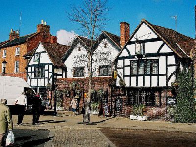 The first thing that strikes one walking across the medieval center of Stratford-Upon-Avon is the abundance of timber-framed Tudor houses. Their most notable feature, often combined with an overhanging upper story, is an exposed wooden framework; the rest is typically filled with brick, plaster or wattle-and-daub.