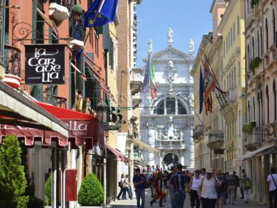 As well as the historic buildings, beautiful architecture and gondola rides, Venice is also a great place to shop. The most famous streets for shopping are in the Le Mercerie area of the San Marco District. The streets and boulevards stretch all the way from the Rialto Bridge to St. Mark's Square and are packed with stores and stalls selling just about everything under the sun. Among the many items you can purchase here are the latest fashions, jewelry, costumes and souvenirs.